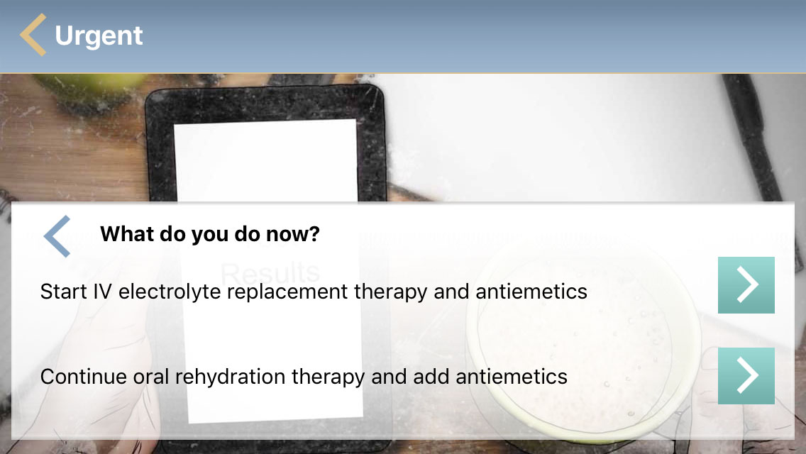 If you make a wrong decision, the case immediately ends, usually in disastrous way, explaining it was because of your mistake. It provides you with an explanation of what you did incorrectly, referencing the resources. There are no branch points and consequences like in Prognosis app that would be more realistic.