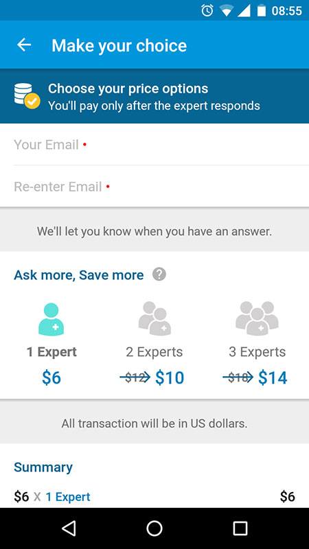 The Curely app also offers a discount for patients who choose to contact more experts at once. The price for an email from 2 experts is discounted from $12 to $10, while the answer from 3 experts costs $14 instead of usual $18. Follow-up questions are usually included in the price.