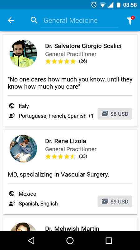 Patients with a health question or concern, can also scroll through the doctors, browse their profiles and prices, then decide which one to consult. You've noticed that I again mentioned the price.