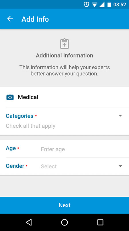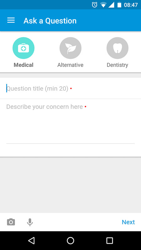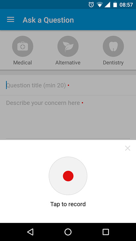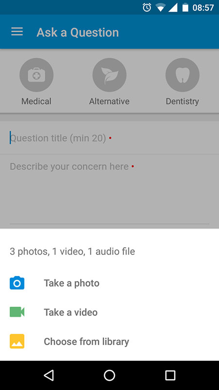 Each question requires a type of the problem (Medical, Alternative, or Dentistry), a title with no less than 20 characters, and a brief description of a problem. Users can add photos or videos to their question, for example, if the problem can be better explained visually (rash, lump, etc.), or they can record an audio and attach it to their question.
