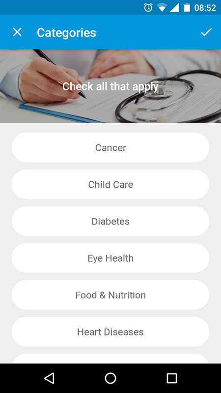 Patients then can proceed to add categories that apply to their question, sorted alphabetically, and ranging from Cancer to Women's Health. You'd probably notice that many specialties and conditions are not included, such as gastroenterology, respiratory disorders, neurology, etc.