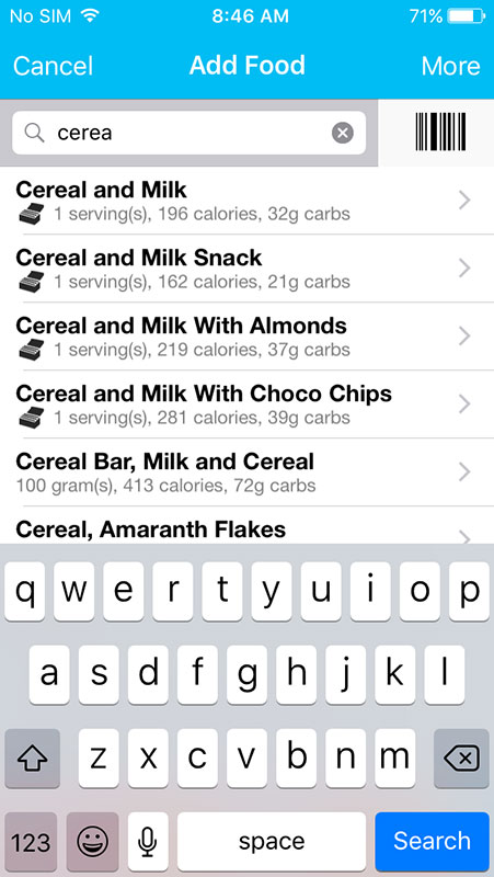 Adding food from the database works two way, and both are very easy. First is by using search that has autocomplete and populates the list as you type. Another, even convenient way is by scanning the barcode on the food package. Diabetes in Check app utilizes your phone camera and turns it into a barcode scanner.