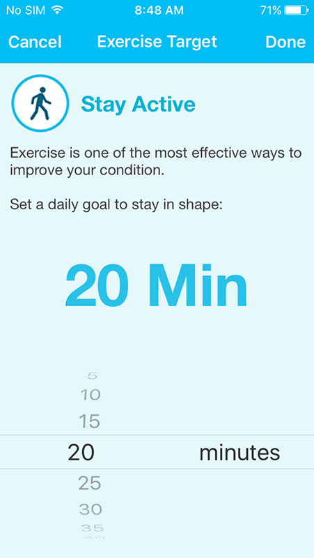 Diabetes in Check app can be used to track your exercise by setting the daily goal and choosing the type of the activity and duration. The app calculates the calories burned based on your weight and adds that number back to your calorie budget.