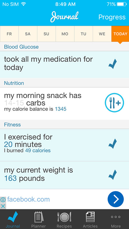 The app opens to the Journal page where you can easily track your blood glucose levels, medications, carbs, exercise, and weight. The today is marked by default, but you can see other days of the week (and switch between them) at the top of the screen.