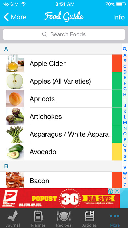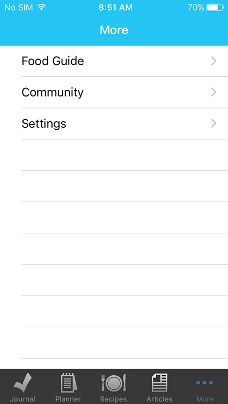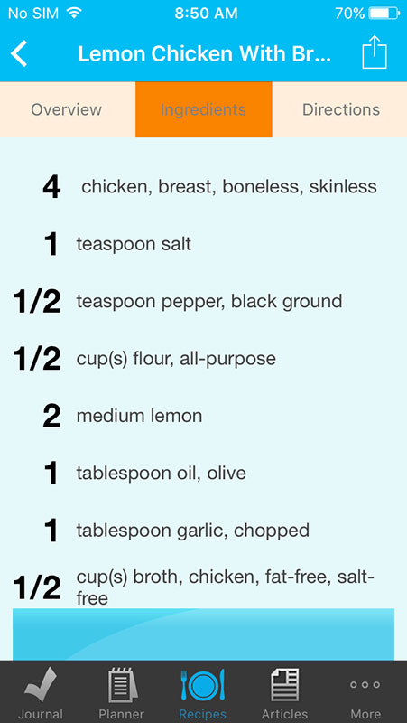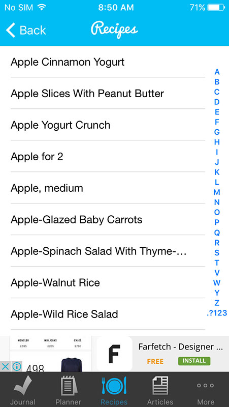 Beside Journal tab, used for tracking and viewing progress, there are also other tabs, including Planner, Recipes, and Articles.