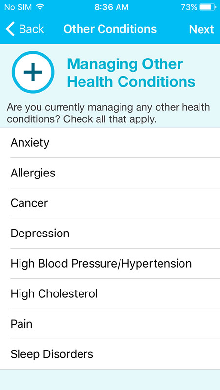 Upon starting the app, you'd be asked to register an account and choose the type of diabetes you have. Diabetes in Check would then allow you to add other conditions you can track and manage with this app, including anxiety, allergy, pain, high blood pressure, high cholesterol, and more.