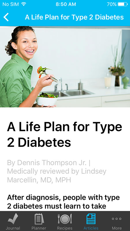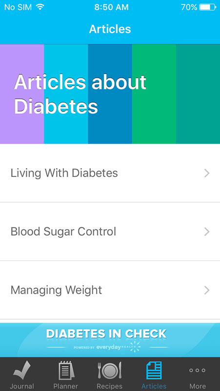 Finally, the Articles section provides useful articles about diabetes, grouped in categories that cover important topics, such as living with diabetes, blood sugar control, managing weight, and so on. All content originates from Everyday Health, the creators of the app.