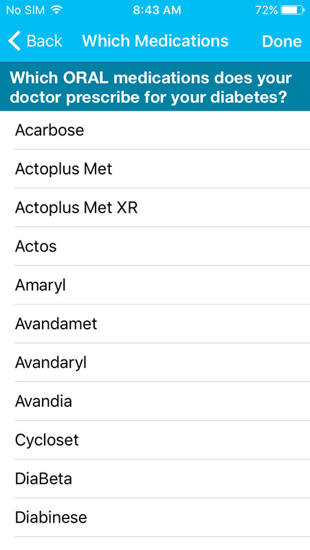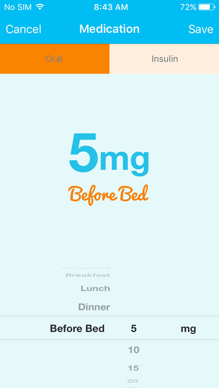 Besides BG levels, you can track your medication use. First, you need to choose between oral medications and insulin. Since this app is designed for Type 2 diabetes, I've chosen oral meds. Next step is setting the time of the day when you take your meds, and then choosing from the list of common oral medications. You can set the dose from the Journal page.