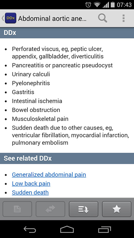Finally, under Diseases you will find a huge list of differentials based on various diseases, from abdominal aortic aneurysm to herpes zoster.