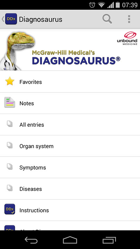 McGraw-Hill Medical's Diagnosaurus DDx by Unbound Medicine is that kind of app that allows medical students and physicians to quickly access over 1,000 differential diagnoses by organ system, symptom, or disease.