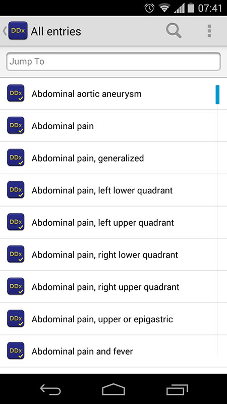 Opening Symptoms category will give you differentials on common chief complaints, also listed alphabetically, starting with several types of abdominal pain.