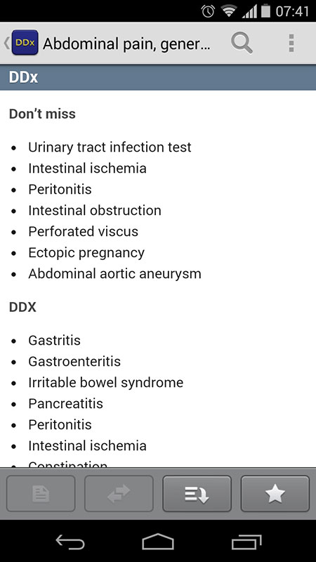 You'll notice that the conditions or symptoms pages don't provide you with too much information. Differentials are listed in a form of bullets that list all potential diagnoses related to the symptom, only giving you a hint what could be wrong with your patient.