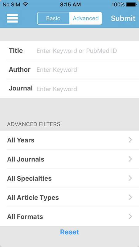 You can also use Search that allows you to find articles by title, author name or journal they've been published in, or by including advanced filters, i.e. year, specialty, format, article type, etc.