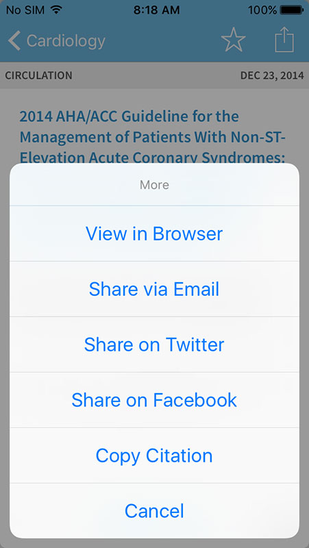 Opening any article will actually open abstract, and these can easily be viewed and shared via email or social networks. You can also tap on the Star icon to save articles into your Saved folder.