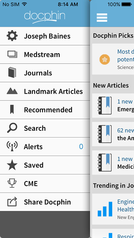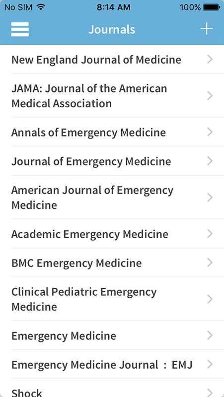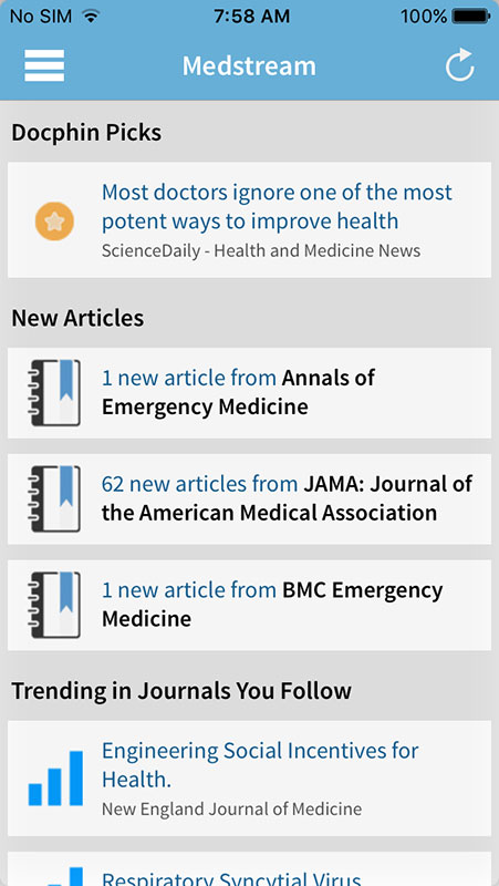 On the Medstream page, you'll see Docphin picks, new articles and articles trending in journals you follow. Based on my selections (emergency medicine), I've got 11 journals from New England Journal of Medicine, JAMA, to Emergency Medicine Journal and Shock.