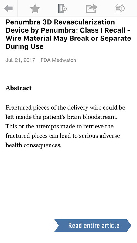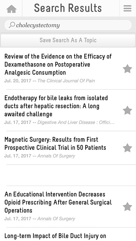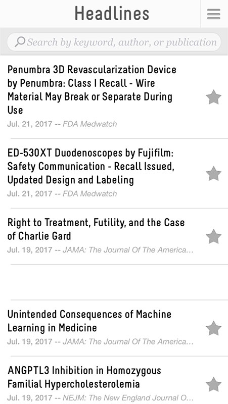 As said, the Home page contains the initial collection of news and articles based on your specialty. For Internal Medicine there was a lot of topics, and I noticed that the NEJM articles and news from FDA MedWatch dominate the main screen.