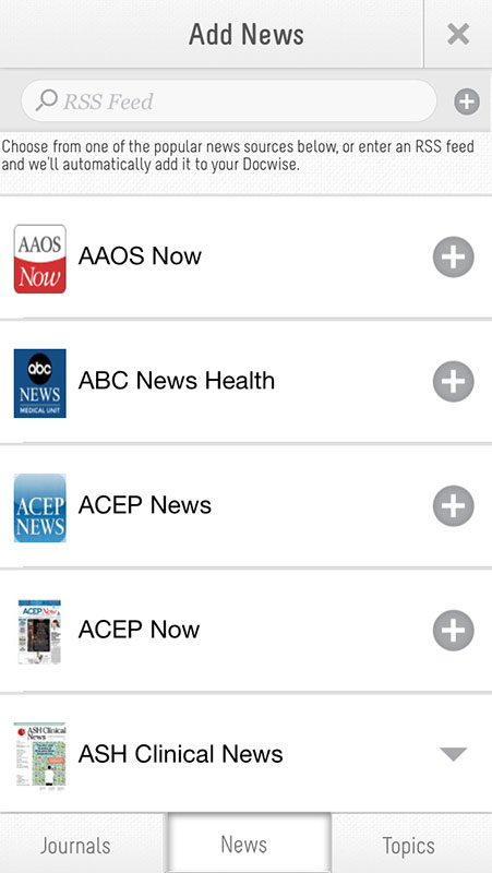 DocWire app isn't only limited to your specialty. You can add resources for other specialties as well. To do that tap on Menu icon on the top right of the screen. There is a blue 'Add' button enabling you to add additional journals based on other specialties, ranging from General to Urology and Vascular Surgery.