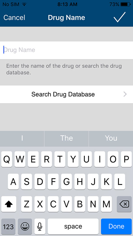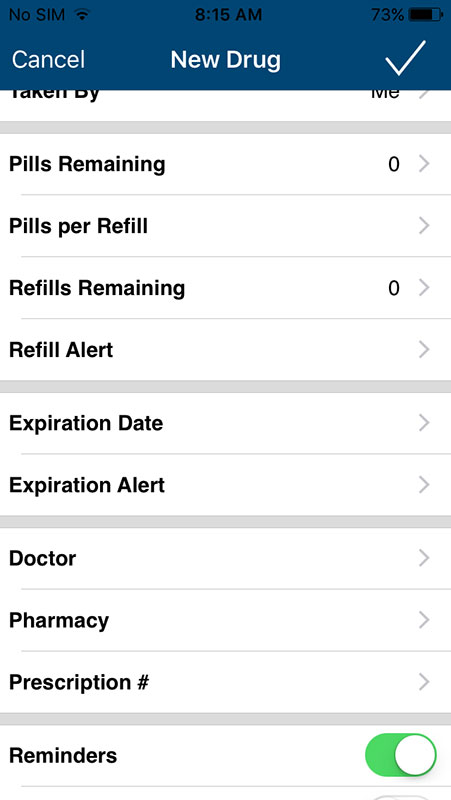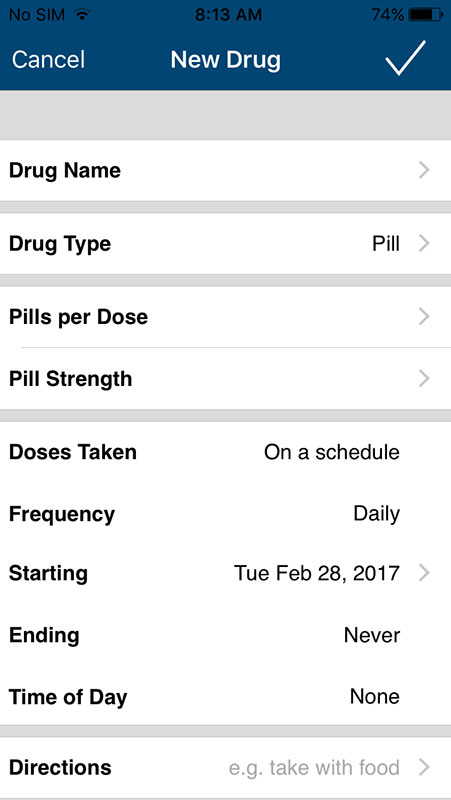 Dosecast opens to a blank screen with several options in the footer. To start tracking your medications simply tap on plus symbol, which opens a new screen titled New Drug. Here you can simply enter basic information about each medication you take, including the name, type, dosage, strength, frequency, time of day, how you take your medication (on schedule or as needed), etc.