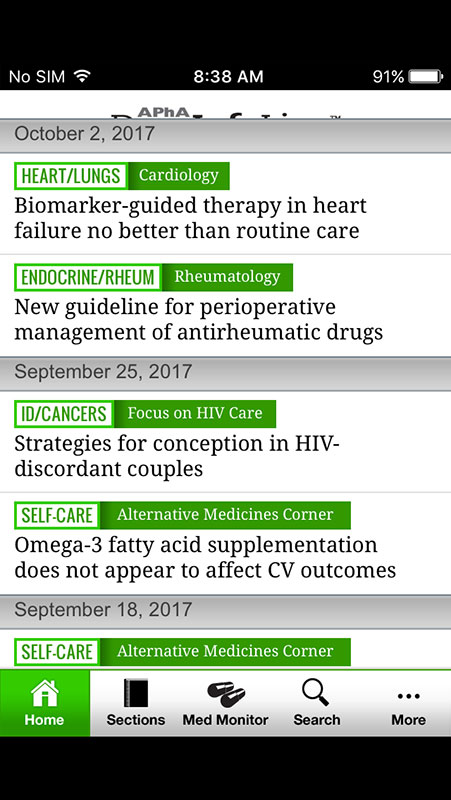 The app opens to the Home page featuring articles (studies and guidelines) listed by date, with the most recent being at the top. Each article has published date and the section/medical category it belongs to. If you've ever visited APhA DrugInfoLine website you'd notice that the app uses the same layout, which is quite easy to use.