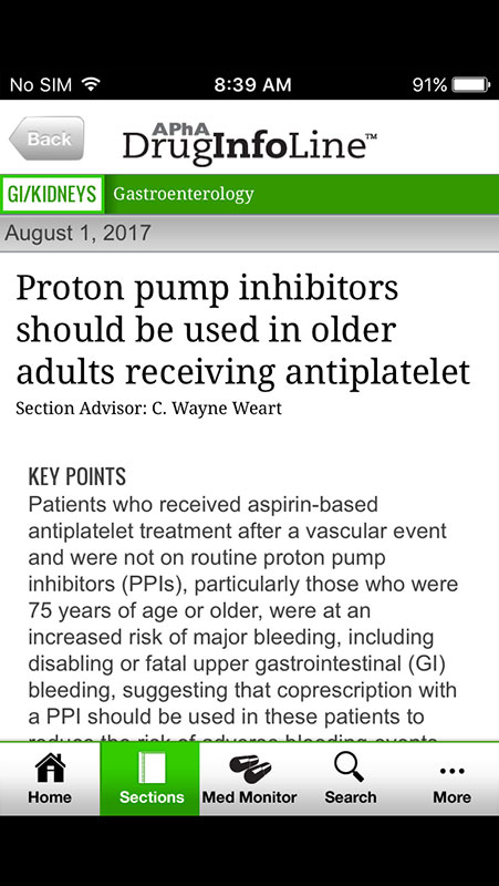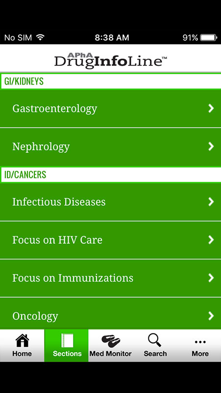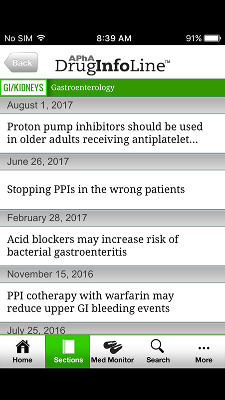 Users can browse the articles by Sections, covering the topics for a particular specialty, such as gastrointestinal or nephrology, diseases, such as infectious disease or HIV, drug type, such as lipids or anticoagulants, personalized care, including interactions and pharmacogenomics, and so on.