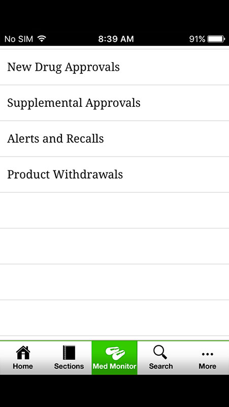 Med Monitor section contains several categories focused on new drug and supplement approvals, as well as alerts and recalls, and product withdrawals. Again, non-members would see the summary of the article, while full access would require a membership.