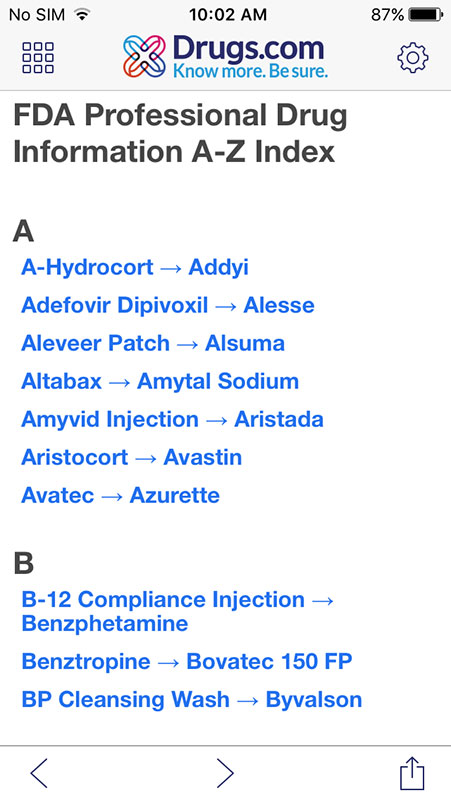 We noticed that the Drugs.com app's drug database is really extensive. It provides FDA labeling in the professional version, while the patient version has more lay-friendly language. Either way, the app allows users to search for medications in a vast list of brand or generic names.