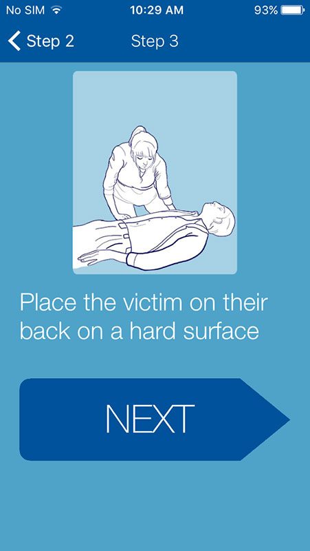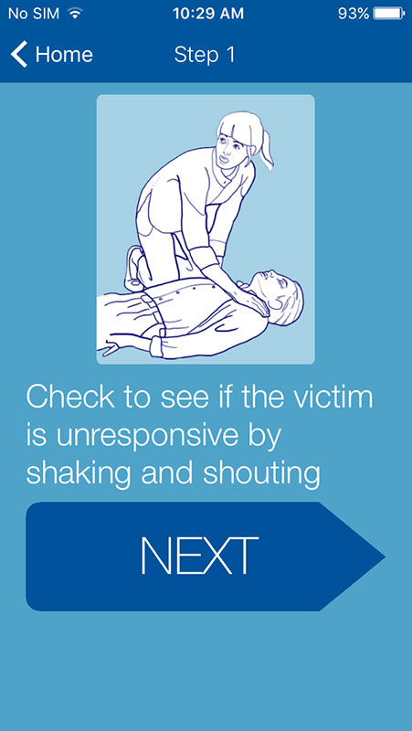 Tapping on Crisis Mode, leads users to detailed step-by-step instructions, which are both illustrated and spoken. First step is to check if the victim is unresponsive. Step 2 includes a quick dial button to call 911. Remaining steps explain the rest of the procedure, from placing the victim on their back to how to perform a CPR.