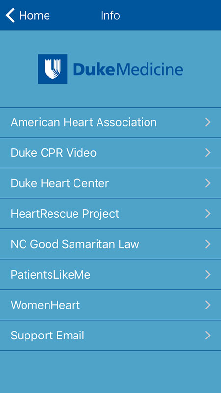 Learn More option offers several reference links, leading to sites such as the American Heart Association, the Duke Heart Center, HeartRescue Project, North Carolina’s Good Samaritan law, PatientsLikeMe and WomensHeart. Here you can also reach creators of the app via support email to get more info about the app or to send feedback.