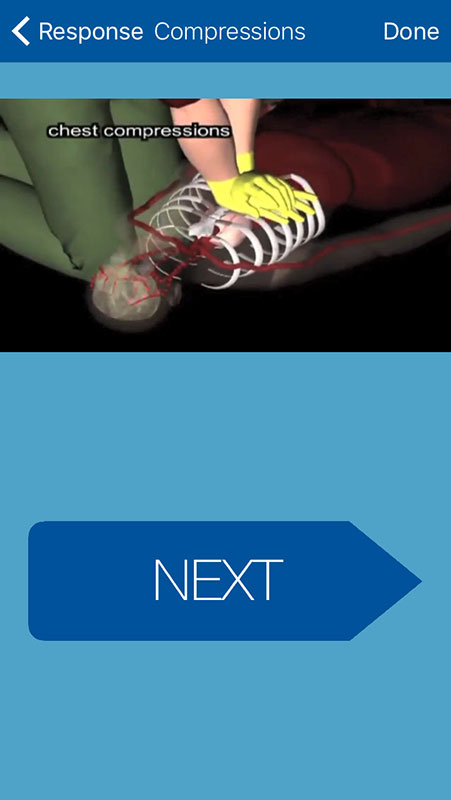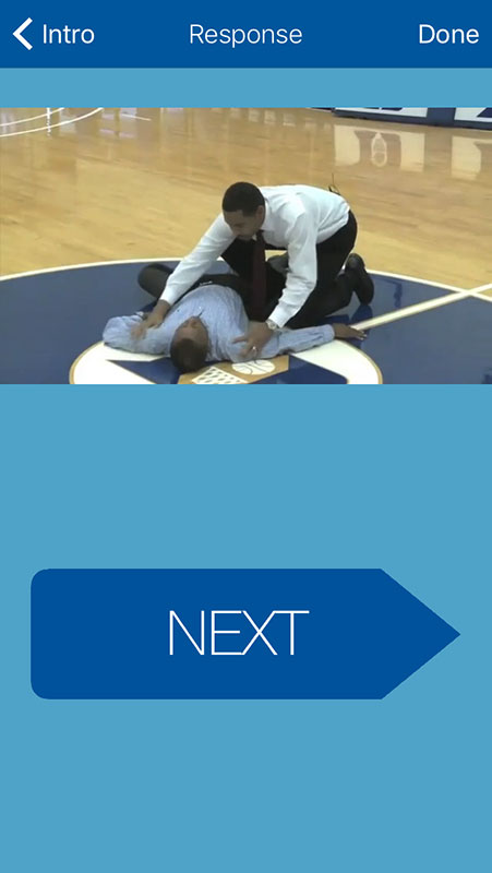 CPR Training Mode leads users through series of videos, featuring Duke athletes and staff, which offer general information about CPR, why it is important, as well as step-by-step guidance on how to perform CPR. All videos are professionally made as a combination of animations and live demonstrations. Videos go full screen when you rotate your phone in landscape mode.