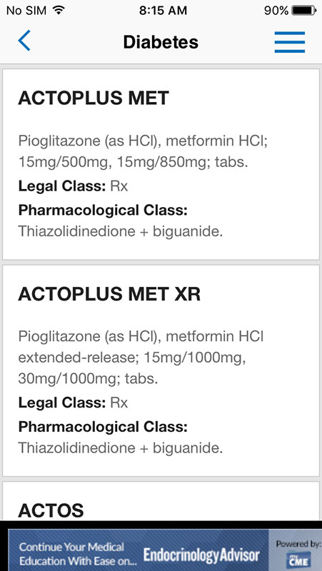 Opening each subsection features a list of medications used to treat particular conditions, both prescriptions and OTC drugs. For example, diabetes section lists drugs from Actoplus Met to Xigduo XR. Tapping on a drug opens drug monograph that includes thorough and well-organized information about usage, contraindications, warning/precautions, interactions, etc.