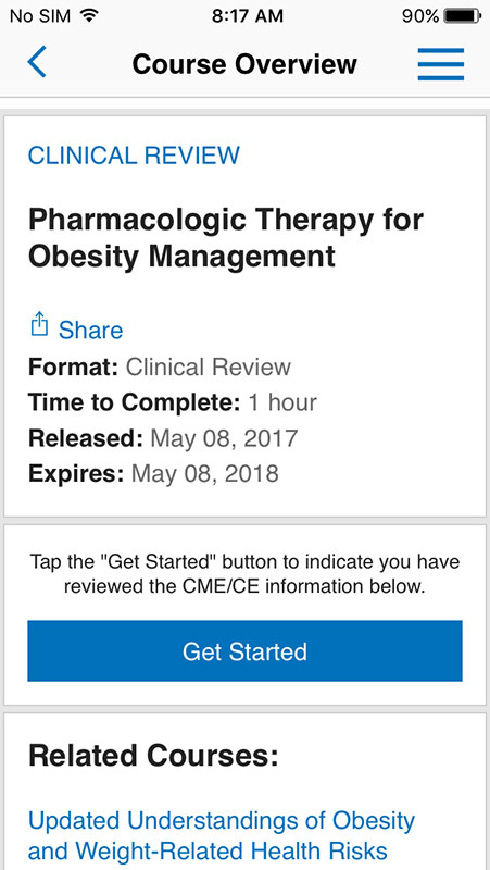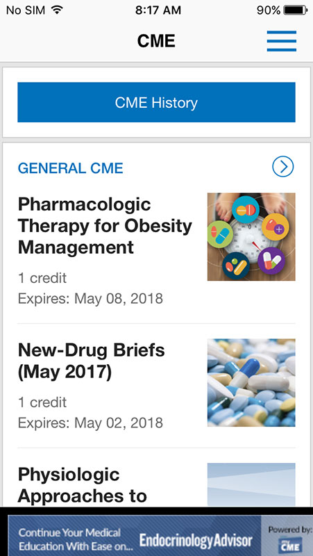 Endocrinology Advisor app also includes CME section, which offers courses on a variety of topics, each being followed by review questions. By answering these questions correctly users earn varying numbers of CME credits, which can be redeemed immediately. However, in order to use CME feature, users must have registered an account with Endocrinology Advisor website.