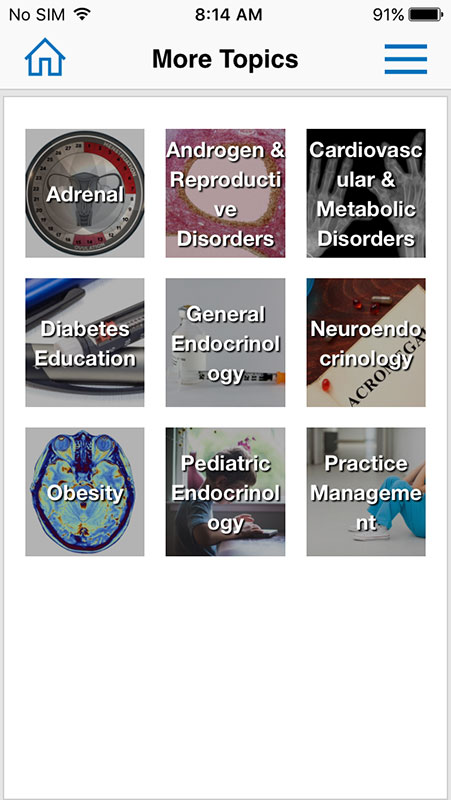 There's also "More Topics" section that includes news and articles for other endocrinology topics, including adrenal, androgen & reproductive disorders, cardiovascular & metabolic disorders, diabetes education, general endocrinology, neuroendocrinology, obesity, pediatric endocrinology, and practice management.