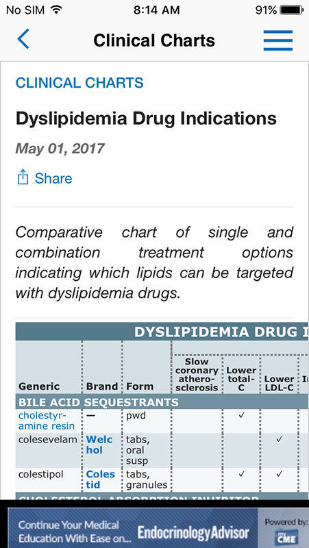 Here in this section, endocrinologists can check different clinical charts, such as dyslipidemia drug indications. They're not mobile friendly tho, not looking well on smaller screens. Also, users cannot adjust the size of the chart, or zoom in or out.