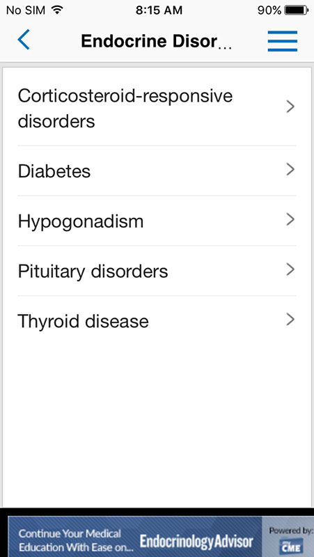 However, most endocrinologist perhaps would be interested only in drugs that cover endocrine disorders. This section is broken down into subsections that include corticosteroid-responsive disorders, diabetes, hypogonadism, pituitary disorders, and thyroid disease.
