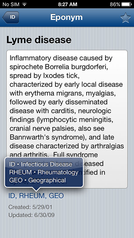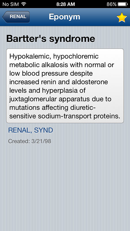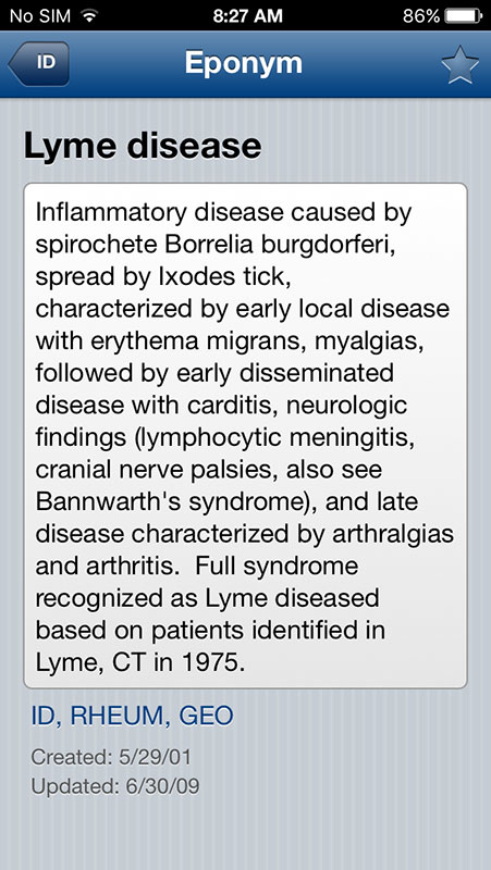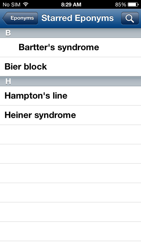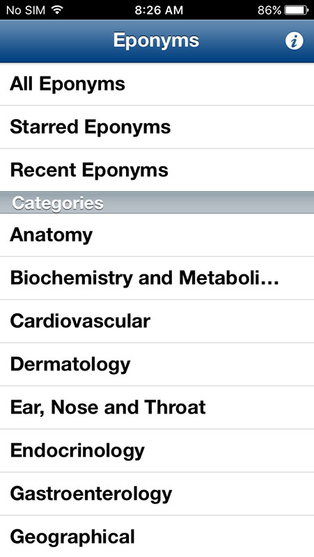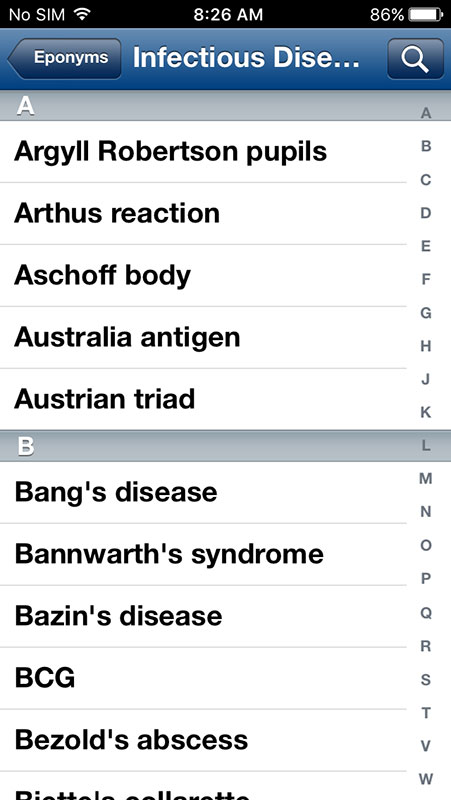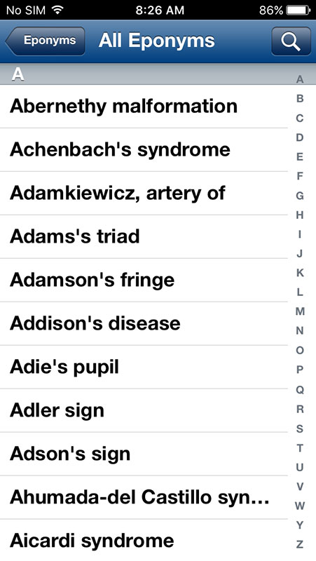 Eponyms are listed in their particular categories in alphabetical order. If you tap on any eponym, you'll see that they provide quick reference, briefly explaining the eponym, i.e. disease, symptom, test, or procedure. Explanations are very brief and do not provide much detail or links to resources used for the information provided in the app.
