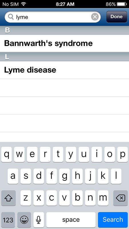 You can also use the search option that works well with auto-complete feature and is the fastest way to find the eponyms, of course if you know what you're looking for. To use it, you need to tap on specific category, because search bar is not available on the home screen.