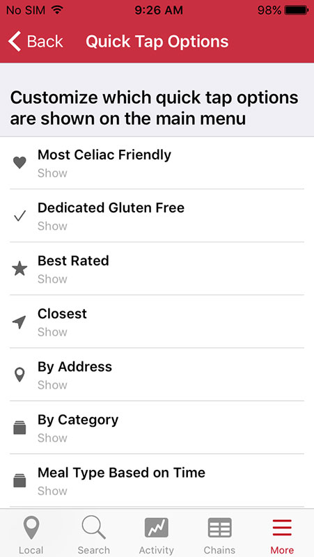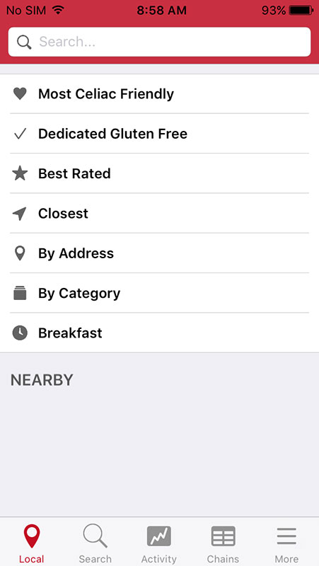 Upon opening the app you may notice a couple of options you can use to search for restaurants, including Most Celiac Friendly, Dedicated Gluten Free, Best Rated, Closest, By Address, By Category, and Breakfast. It's clear from the names of these categories that they're used to filter out the results based on these parameters. You can customize which of these quick-tap categories you want to see on the main menu.