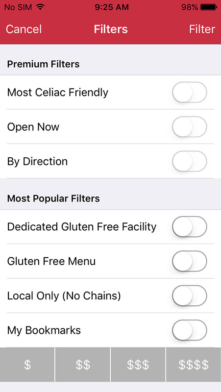 Most Celiac Friendly category (which is probably the most interesting) requires the purchase of Premium for $19.99 per year, which also removes ads and enables two filters which are not available in free version of the app: Open Now and By Direction.