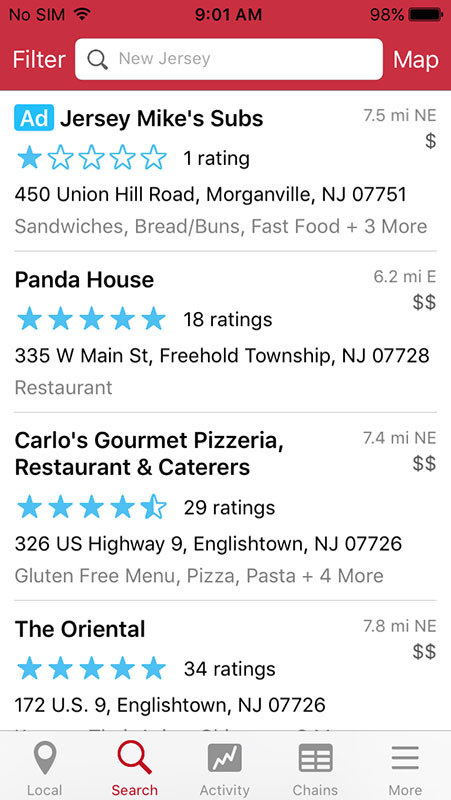 Users can also search nearby restaurants through a map view. The map would show the exact location of a restaurant with directions how to get to it.