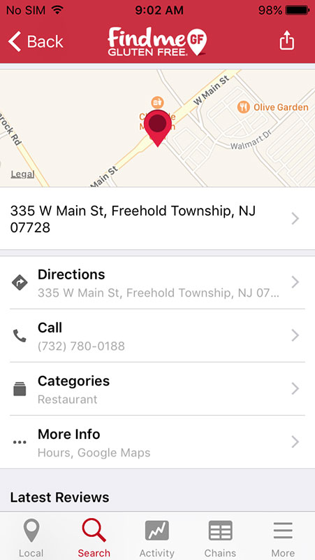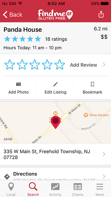 Besides local restaurants, Find Me Gluten Free app also allows you to view details about chains, such as Burger King, Applebee's, and more.