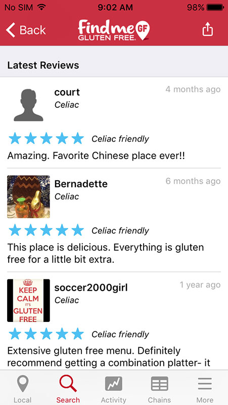 There are also user reviews that can help you decide if the particular restaurant is the best gluten-free option in your neighborhood. The app also allows you to submit your own reviews and ratings in order to help other users.