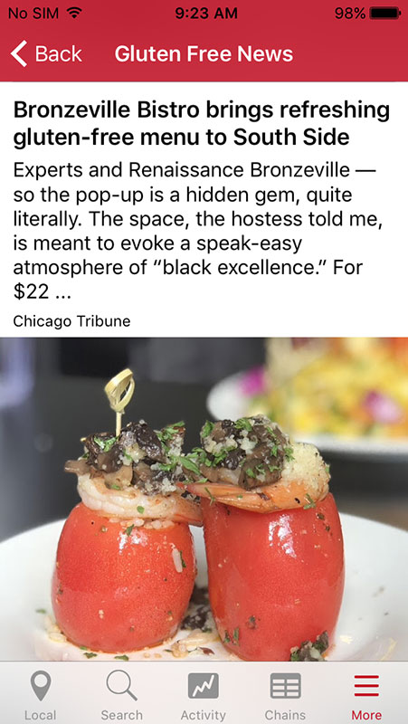 Find Me Gluten Free app is not just restaurant finder. It also provides latest gluten-free news coming from various news sources, such as Chicago Tribune, The Guardian, ABC News, and more.