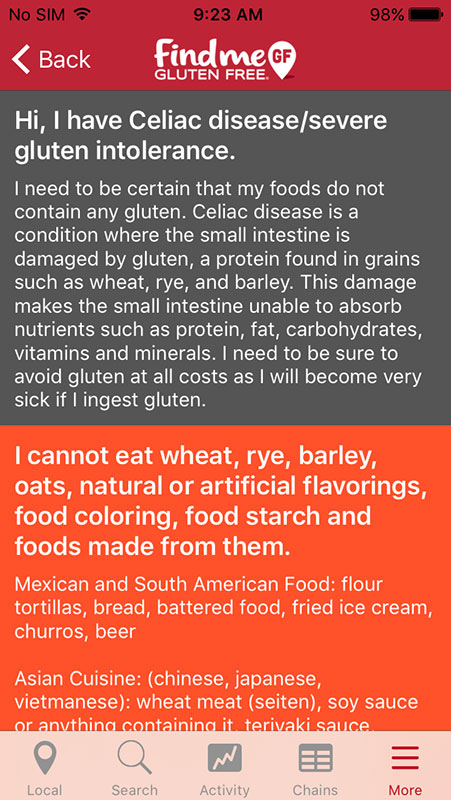 Find Me Gluten Free is one of those apps. It allows people with celiac disease and gluten intolerance, as well as all others who want to stay gluten-free, search for local restaurants that offer gluten-free options, as well as those that have a dedicated gluten-free menu.