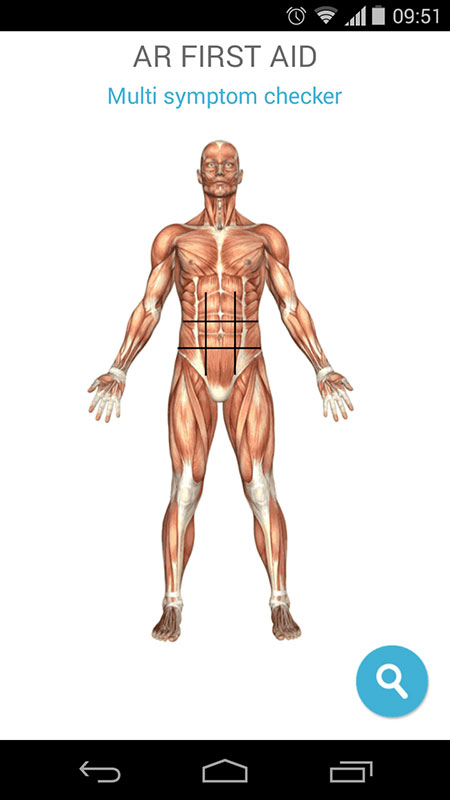 Upon tapping on Atlas icon, you'd see that First Aid Home & Emergency app also features a symptom checker. Users can tap on virtual human body and check various conditions. Some parts are still under development tho, such as head, but you can still check other symptoms, like abdominal or chest pain, limb fractures, etc.