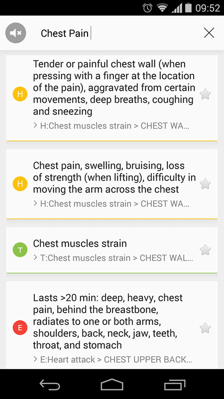 But some results are not clear, for example those for the chest pain that are listed with the letter and different color beside each (blue C, green T, red E, etc.) that probably indicate the emergency level, but I'm not sure how because they're not explained.