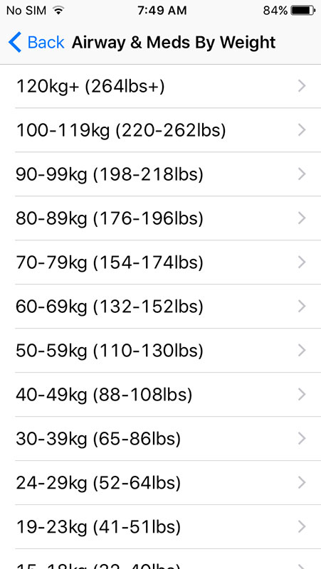 Airway & Meds by Weight category provides detailed description of an airway procedure and all medications used based on the patient's weight, which is listed from 2-3kg (4-7lbs) to 120kg+ (264lbs+).