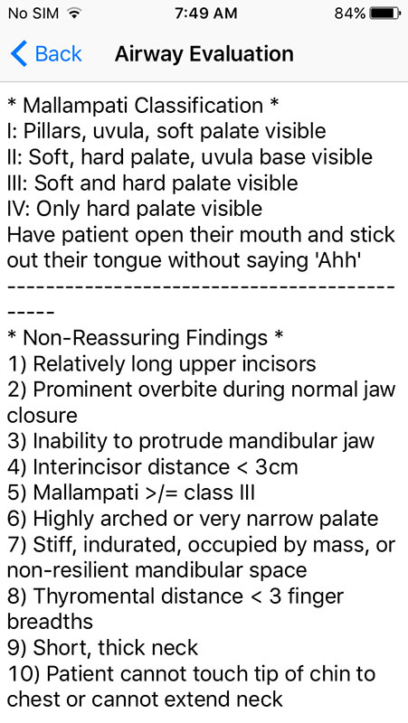 Airway procedure steps are also given here, but the Airway Management category provides the information in more detail, allowing you to learn about anything from initial airway evaluation to how to perform intubation or set the ventilator.