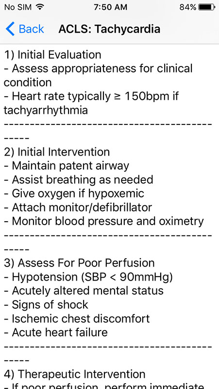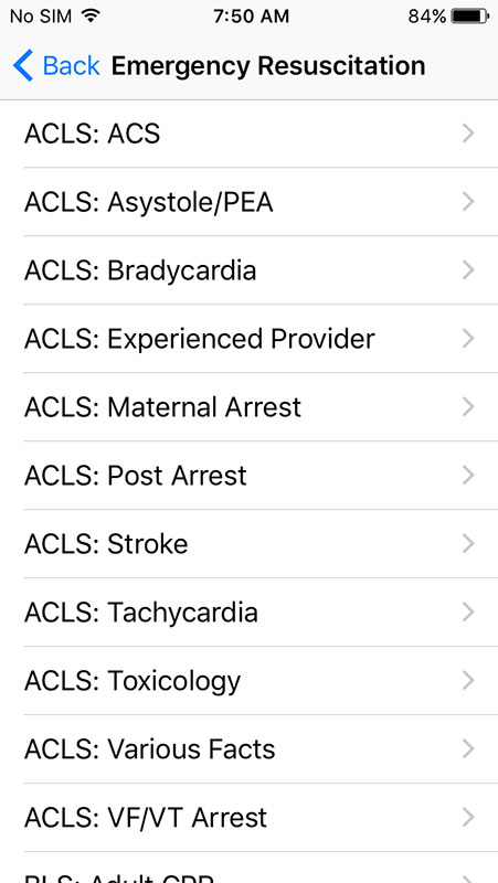 Same goes for resuscitation algorithms, which are also available as a separate category on the main screen. These 'algorithms' are basically recommended steps that cover advanced cardiac life support, basic life support, as well as neonatal and pediatric resuscitation.