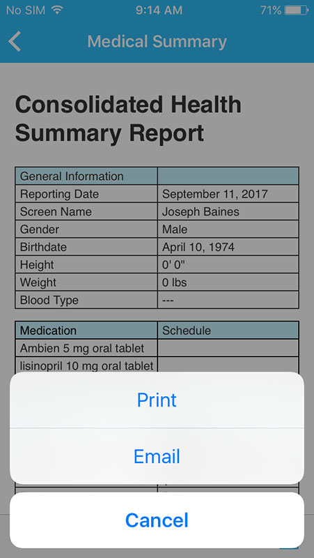 Finally, users can view health summary report with data and charts that can be printed out or shared via email.