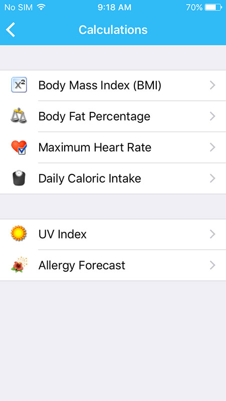 This section also contains comprehensive drug search, interaction checker, as well as calculators, including BMI, body fat percentage, max heart rate, and daily caloric intake. Users can here also check UV index and allergy forecast for their location.